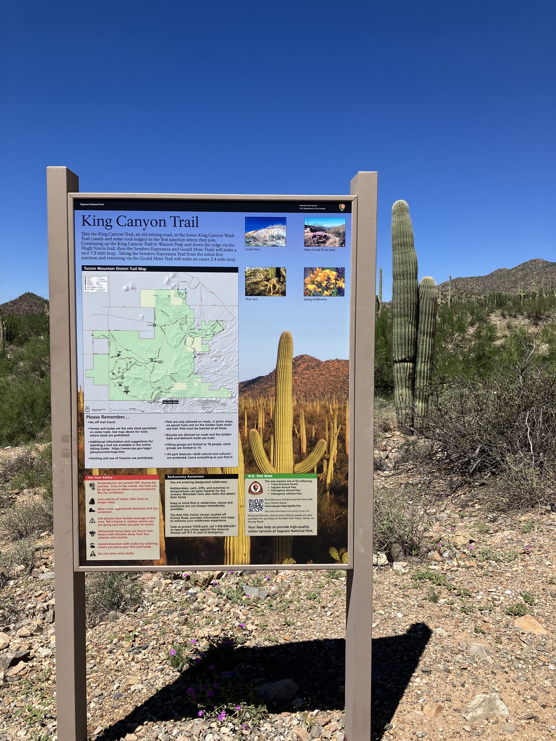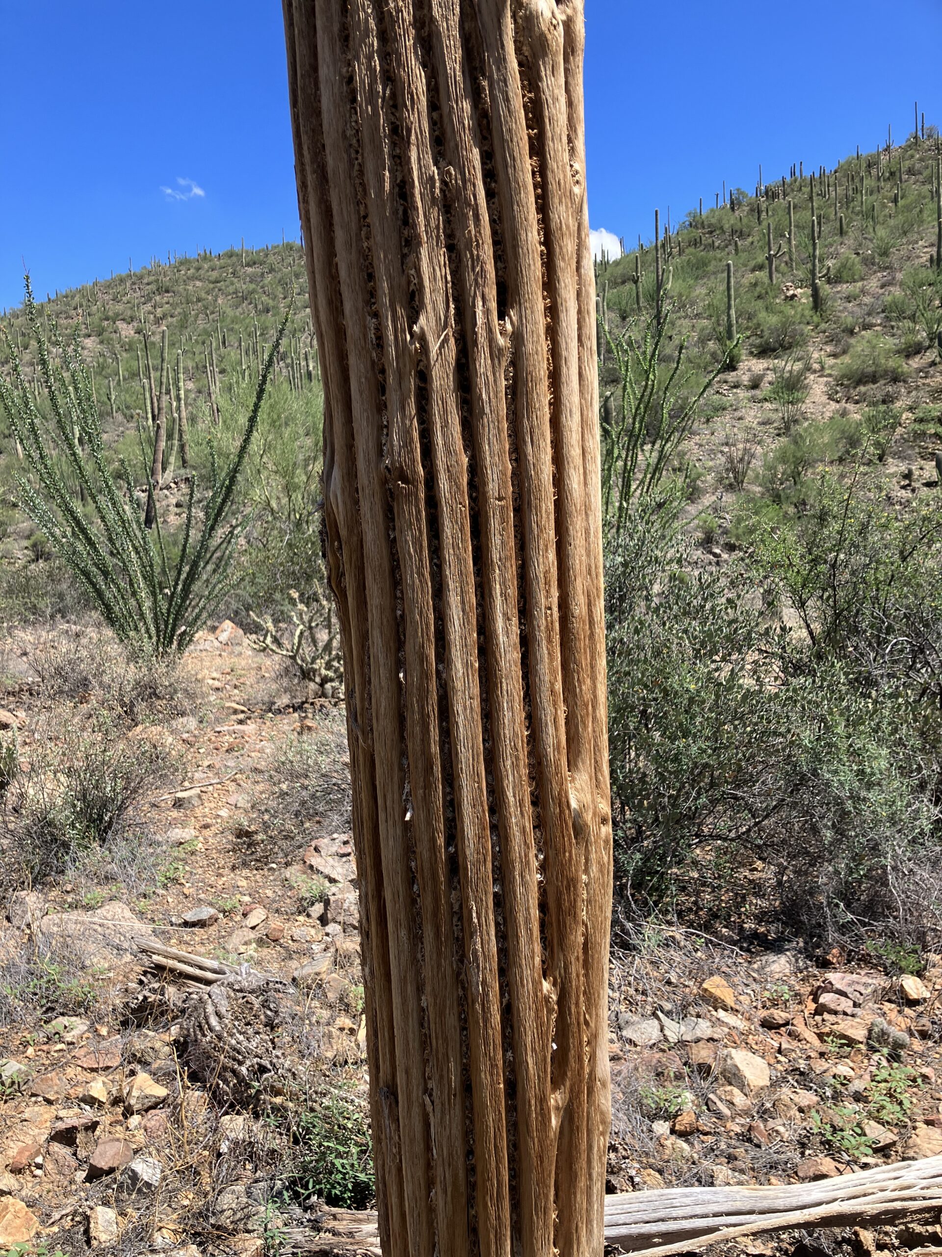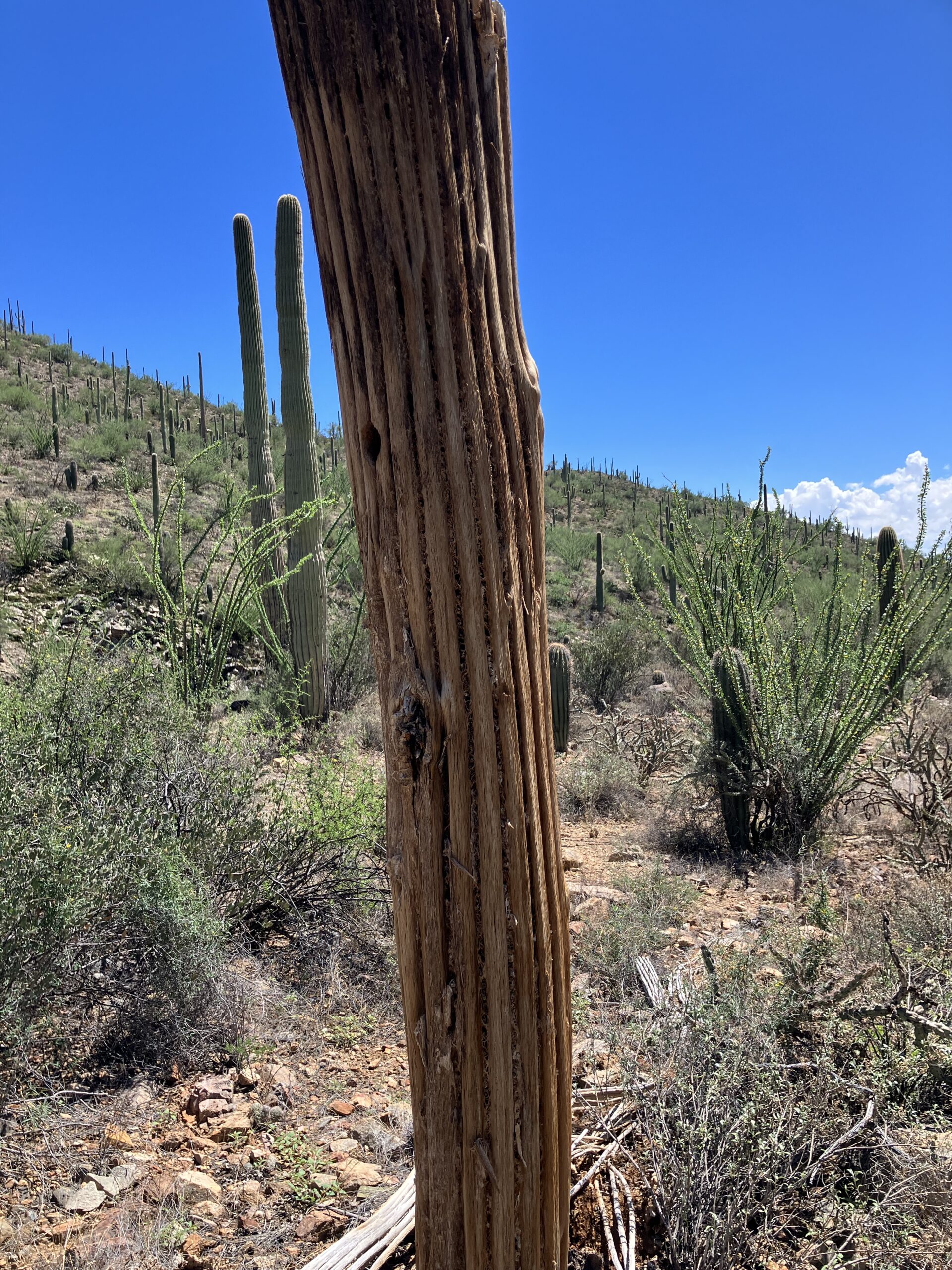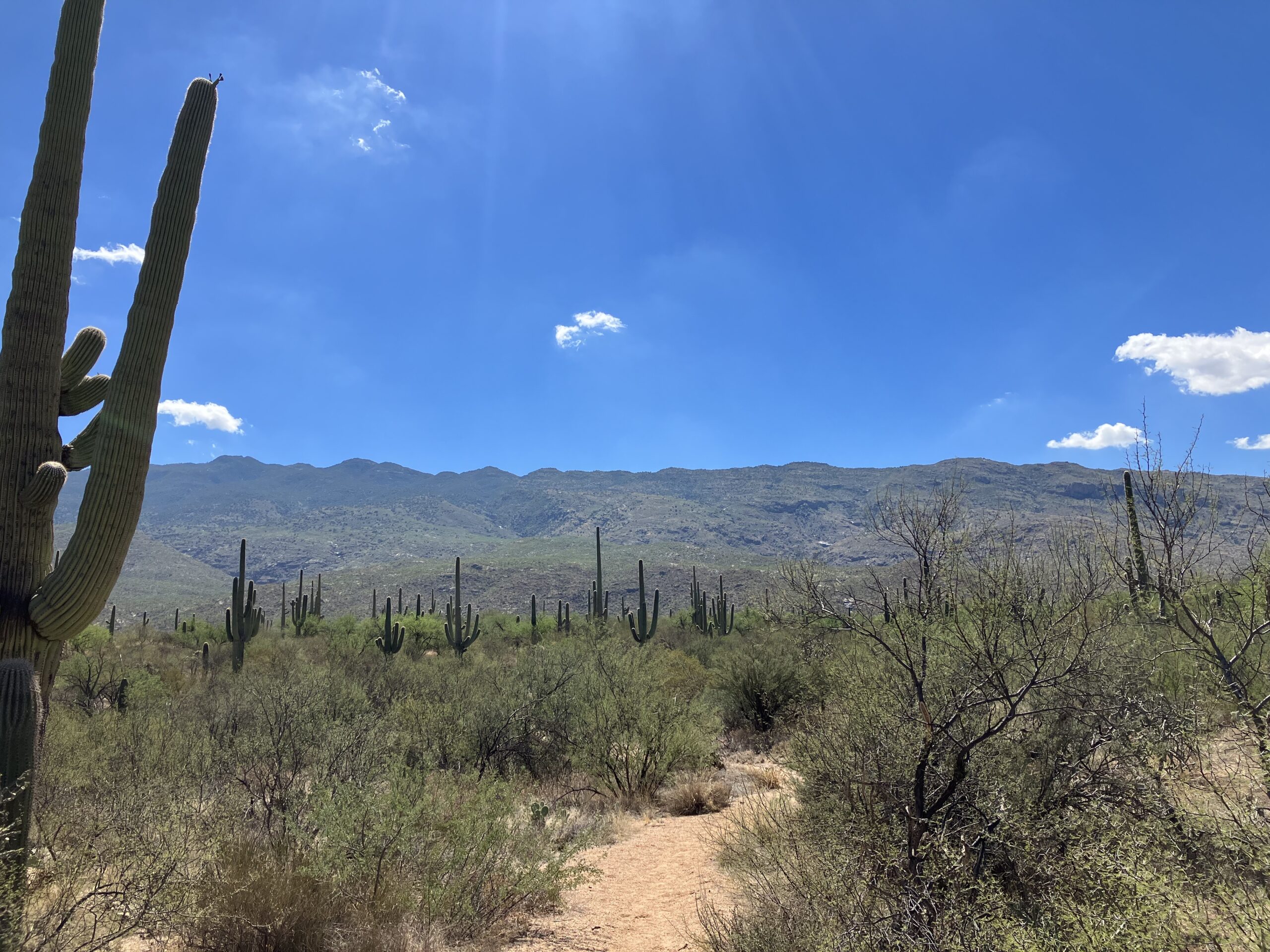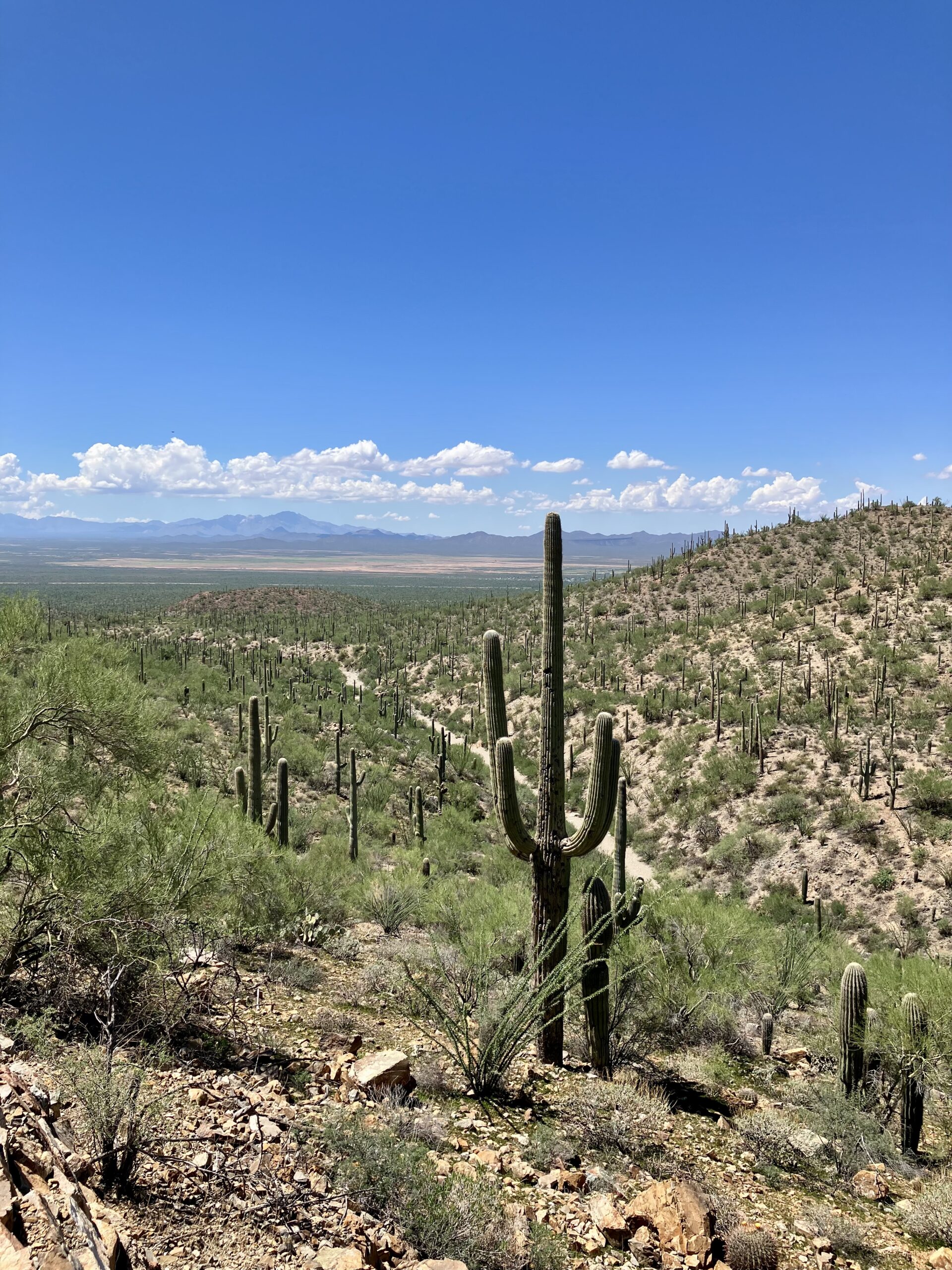 La nuit a été très chaude. Compliqué de bien dormir par cette chaleur malgré la clim, mais nous arrivons quand même à nous lever à 6h30. Nous nous dépêchons de prendre la route pour la partie Est du Parc National de Saguaro, où nous avons planifié une petite randonnée de 6km. Pas de bol, le parc est fermé aux véhicules à cause d’un trail. Il faudra attendre que les coureurs partent pour rentrer. Tout ça nous a fait perdre pas mal de temps, et nous commencons notre balade à 9h45. Il fait déjà plus de 30°. La marche est éprouvante par cette chaleur mais le paysage est magnifique.